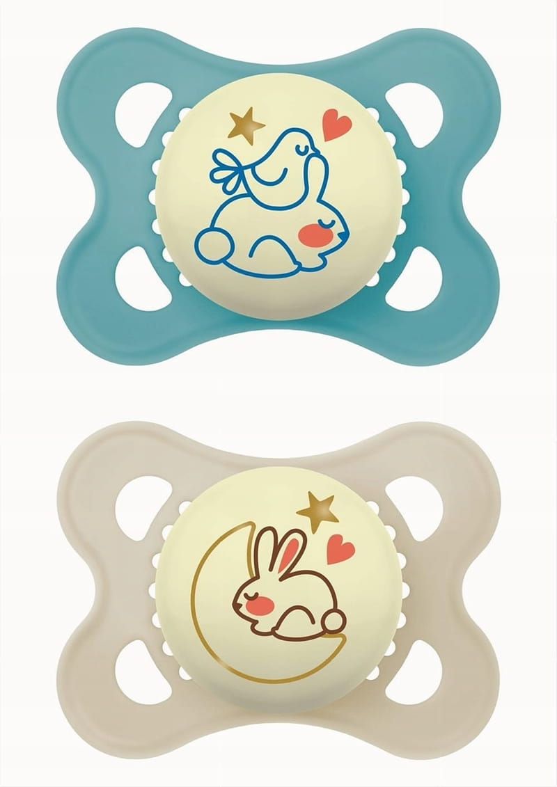 Wspiera zdrowy rozwój jamy ustnej dzięki symetrycznemu i ortodontycznemu kształtowi smoczek jest dopasowany do faz rozwoju żuchwy.