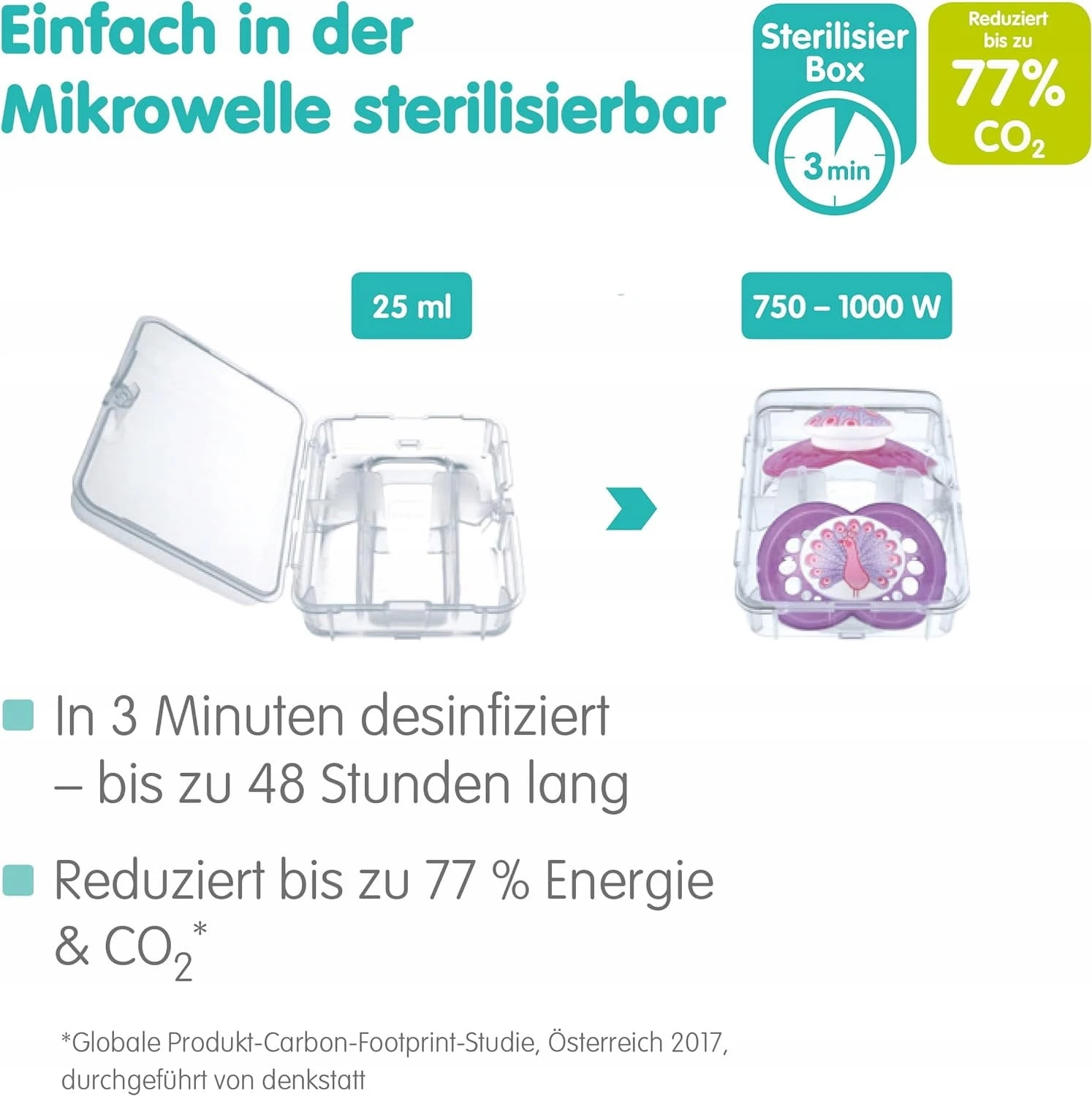 Szybka i łatwa sterylizacja Smoczek MAM Perfect sprzedawany jest w specjalnym pudełku do przechowywania i sterylizacji. Wystarczy wlać wodę, włożyć smoczek i wstawić do kuchenki mikrofalowej na 3 minuty. 100% higieny!