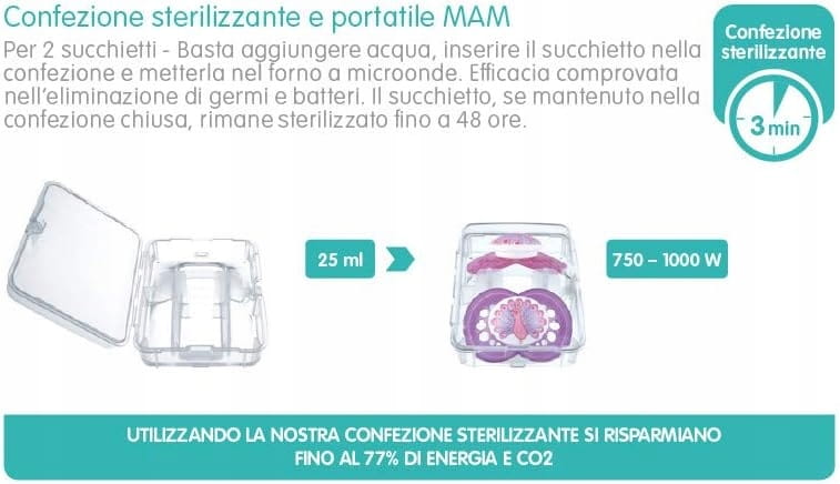 Szybka i łatwa sterylizacja Smoczek MAM Perfect sprzedawany jest w specjalnym pudełku do przechowywania i sterylizacji. Wystarczy wlać wodę, włożyć smoczek i wstawić do kuchenki mikrofalowej na 3 minuty. 100% higieny!